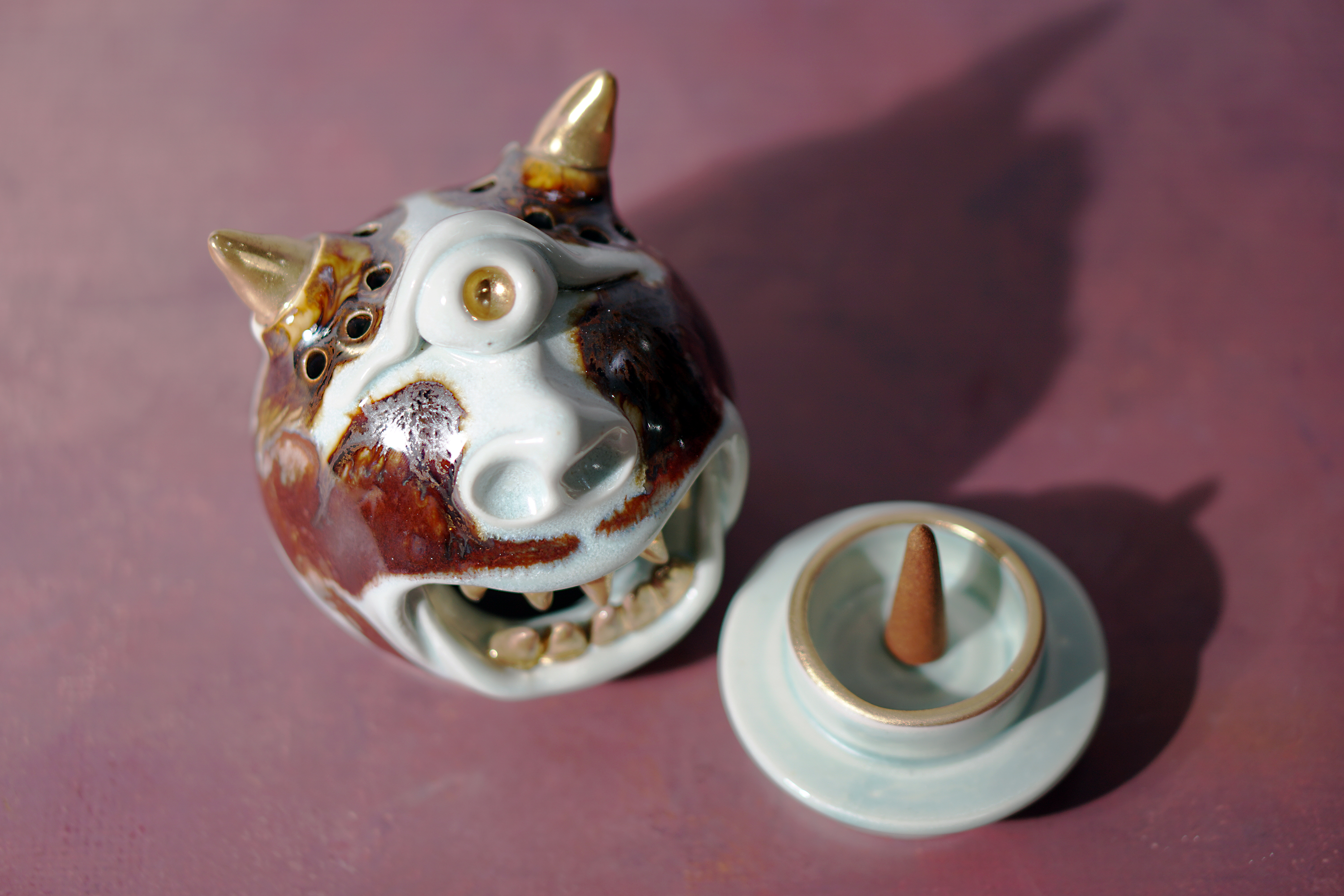 Made by sculpting and wheel throwing, the scent of incense burner spreads subtly through the hollow parts of the lid.