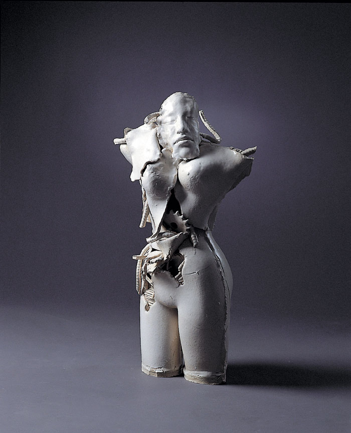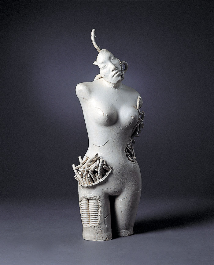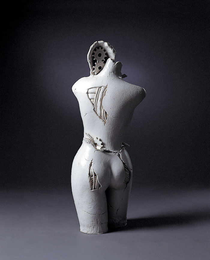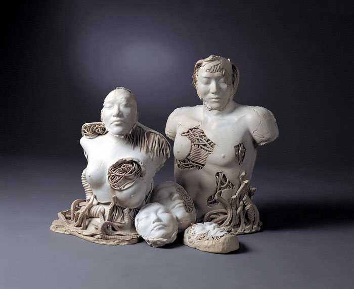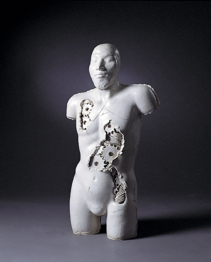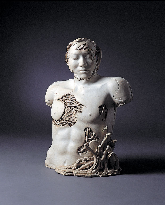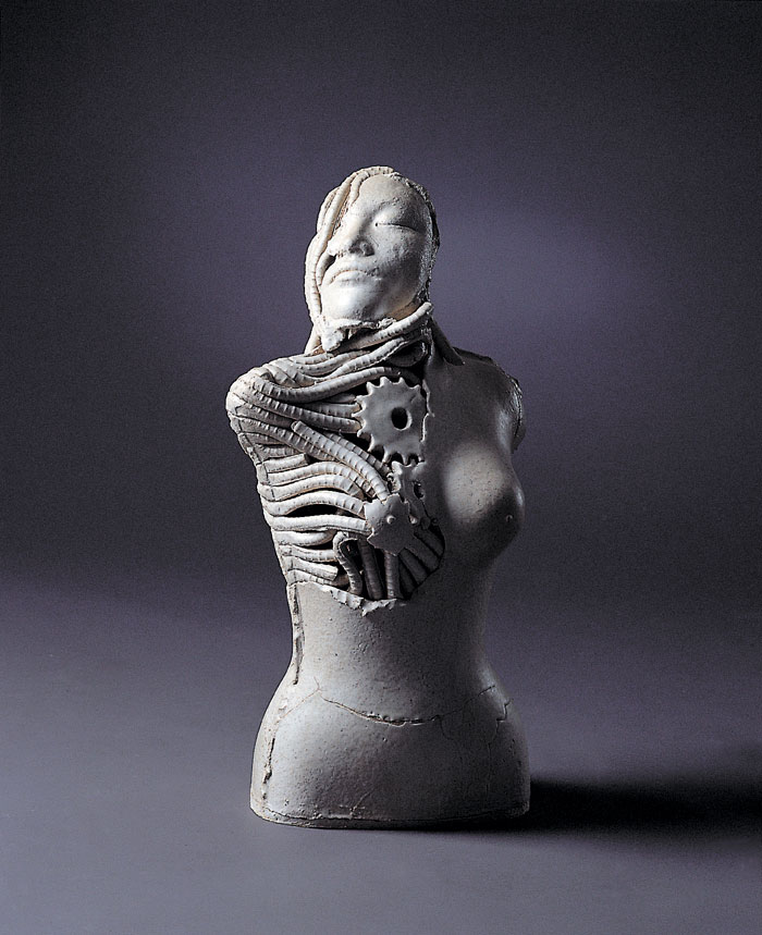 1'st solo ceramic exhibition, 2003 -Humans are born and raised counting on advanced technology and it has tended to be stronger as time goes by. Now we are all becoming cyborgs. (we can't stand a minute without using the Internet and we sometimes implant machines in our body : For example, pacemakers, artificial joints or contact lenses even though they are medical devices, we are on our way to cyborgs.) I want to express the process of being a cyborg from a human.