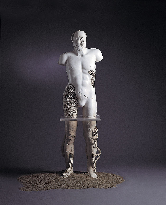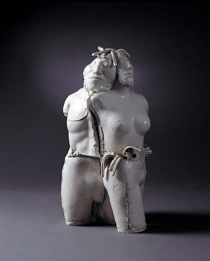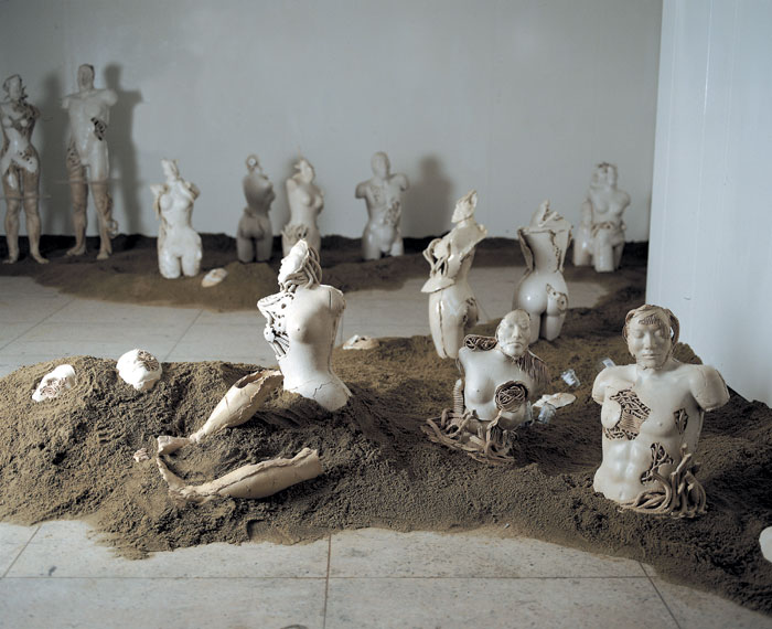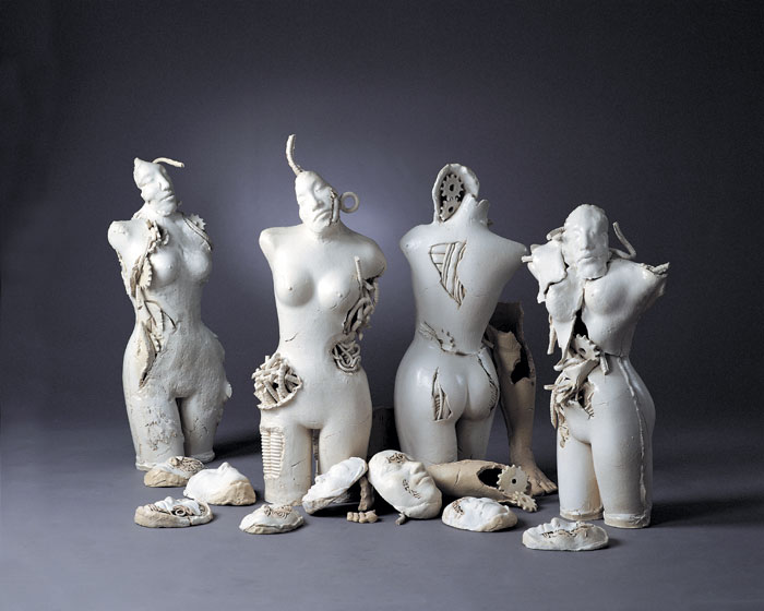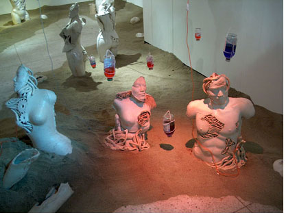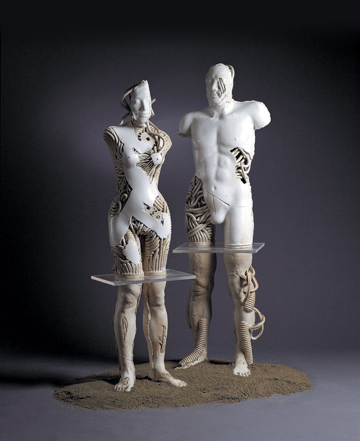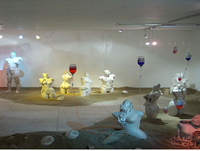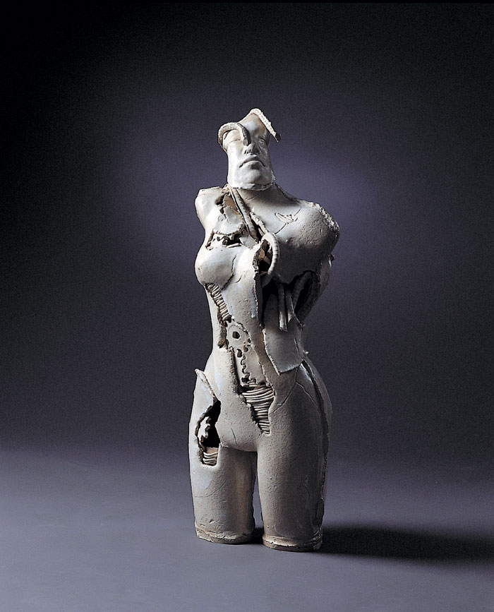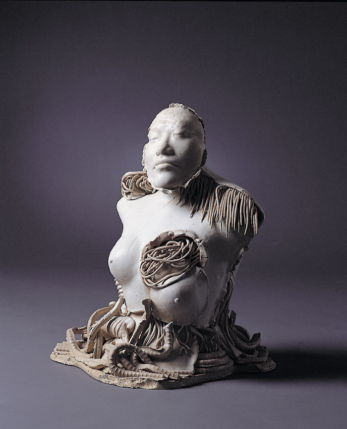 1'st solo ceramic exhibition, 2003 -Humans are born and raised counting on advanced technology and it has tended to be stronger as time goes by. Now we are all becoming cyborgs. (we can't stand a minute without using the Internet and we sometimes implant machines in our body : For example, pacemakers, artificial joints or contact lenses even though they are medical devices, we are on our way to cyborgs.) I want to express the process of being a cyborg from a human.