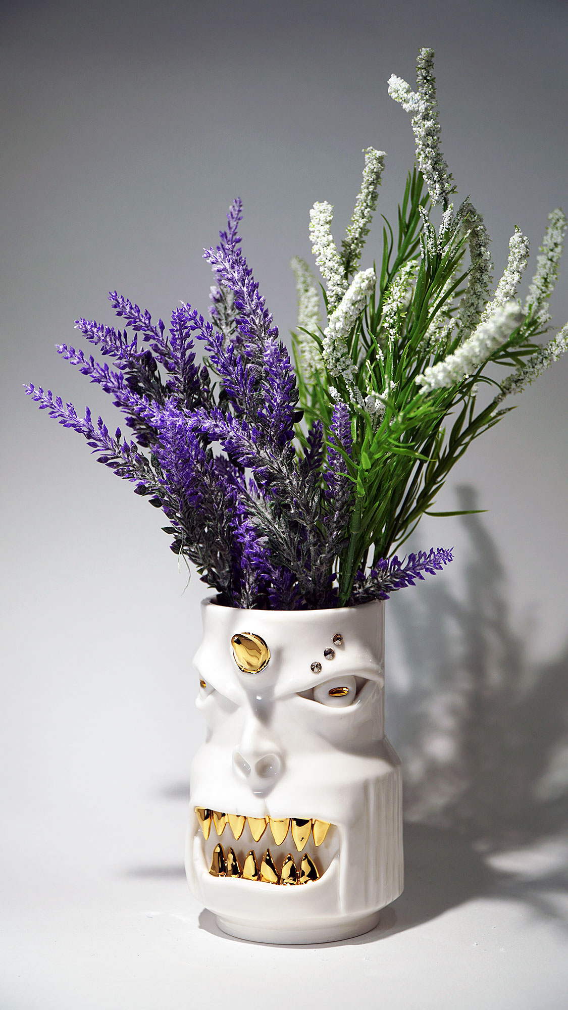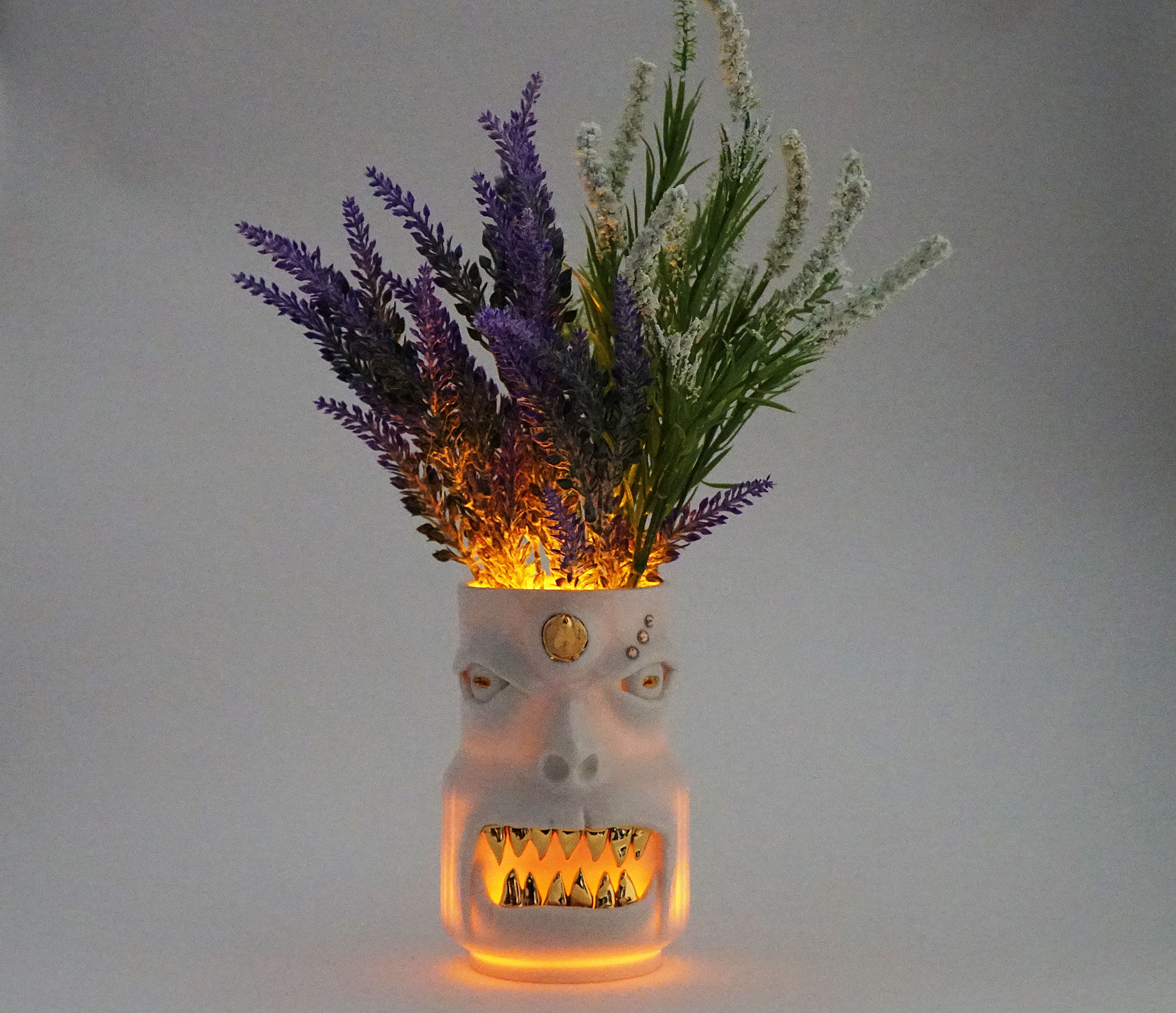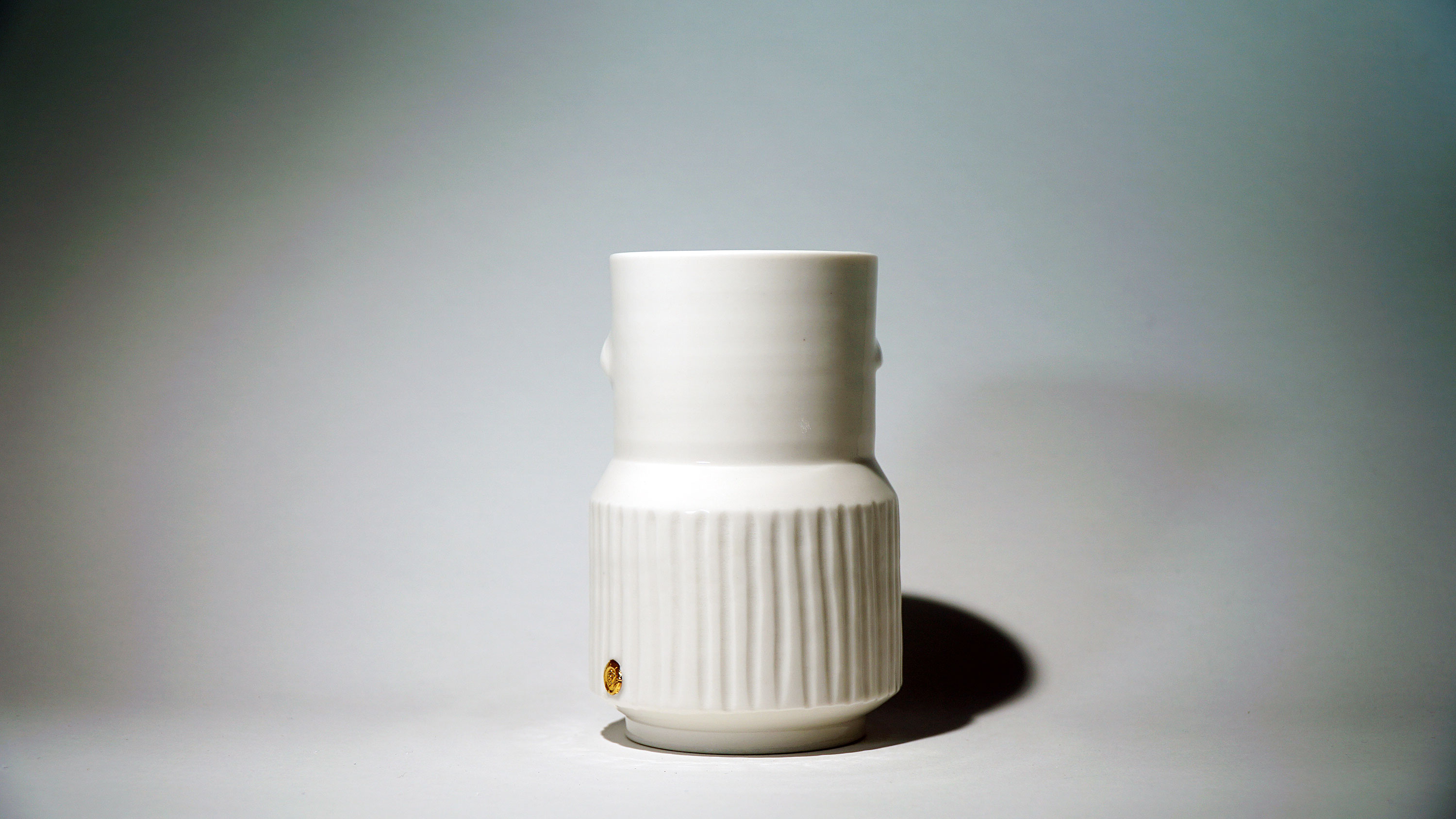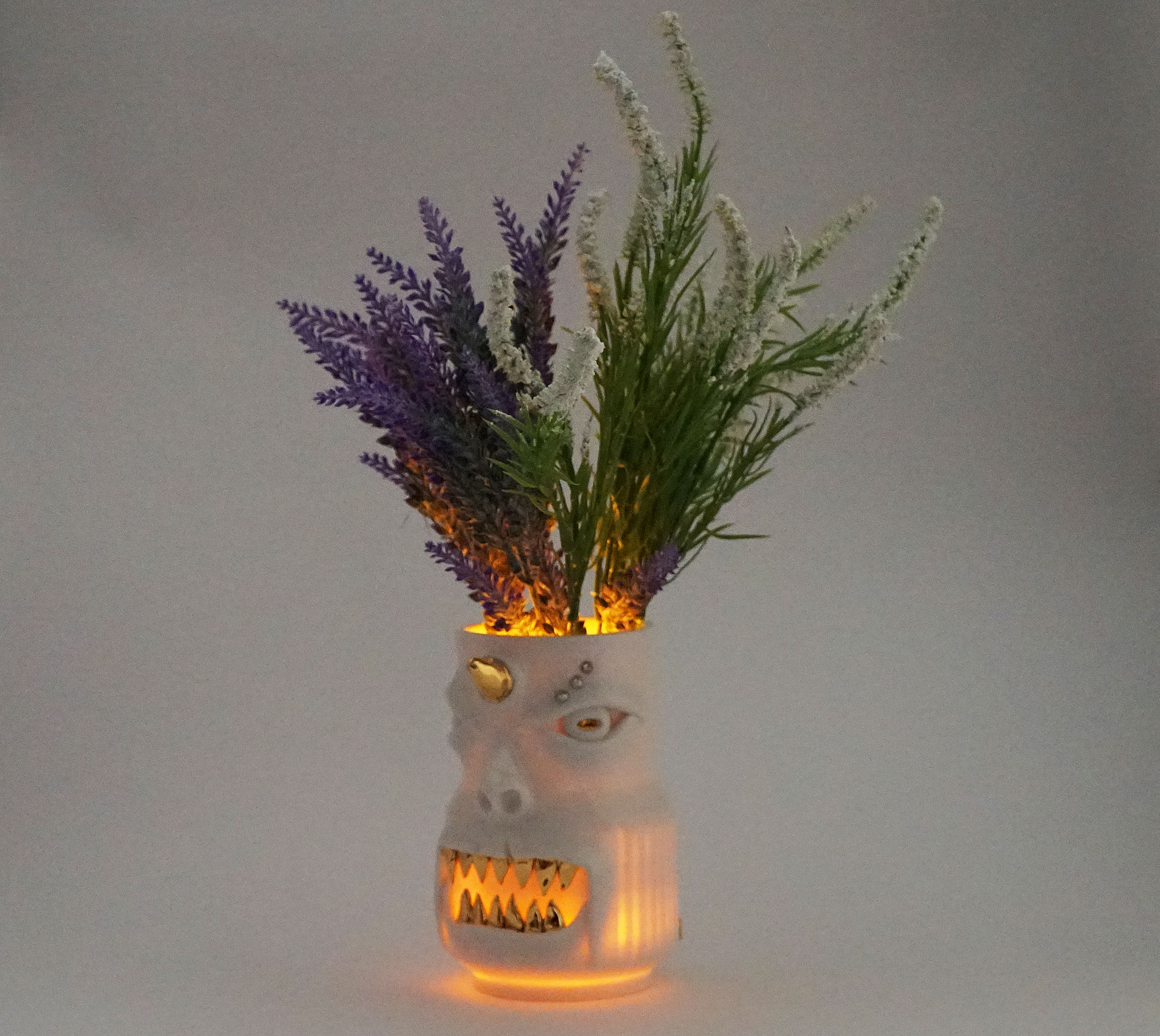 화이트와 골드로 디자인 한 돗가비 화병은 빛을 투과 시켜 은은한 빛을 만들어낸다.