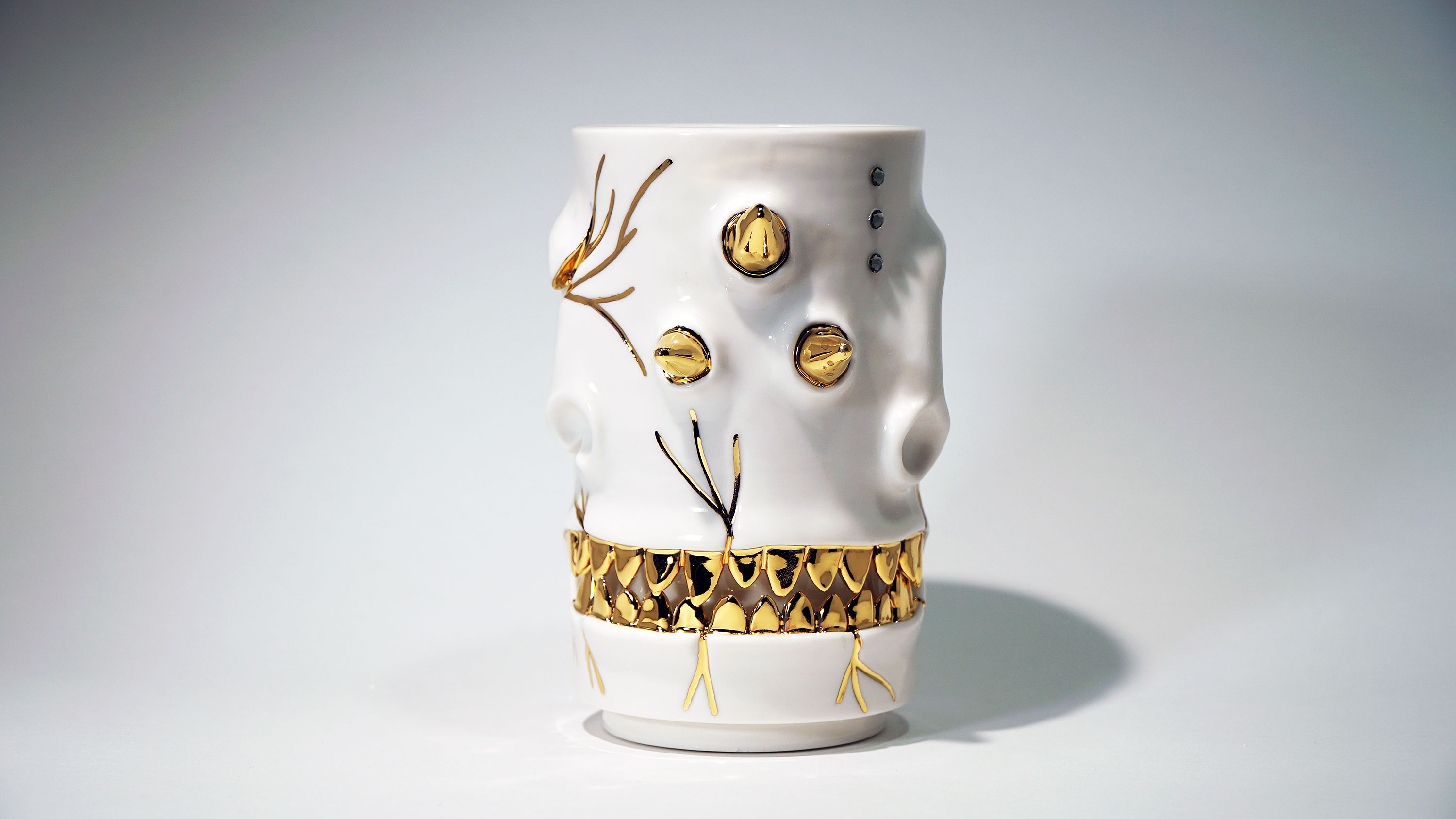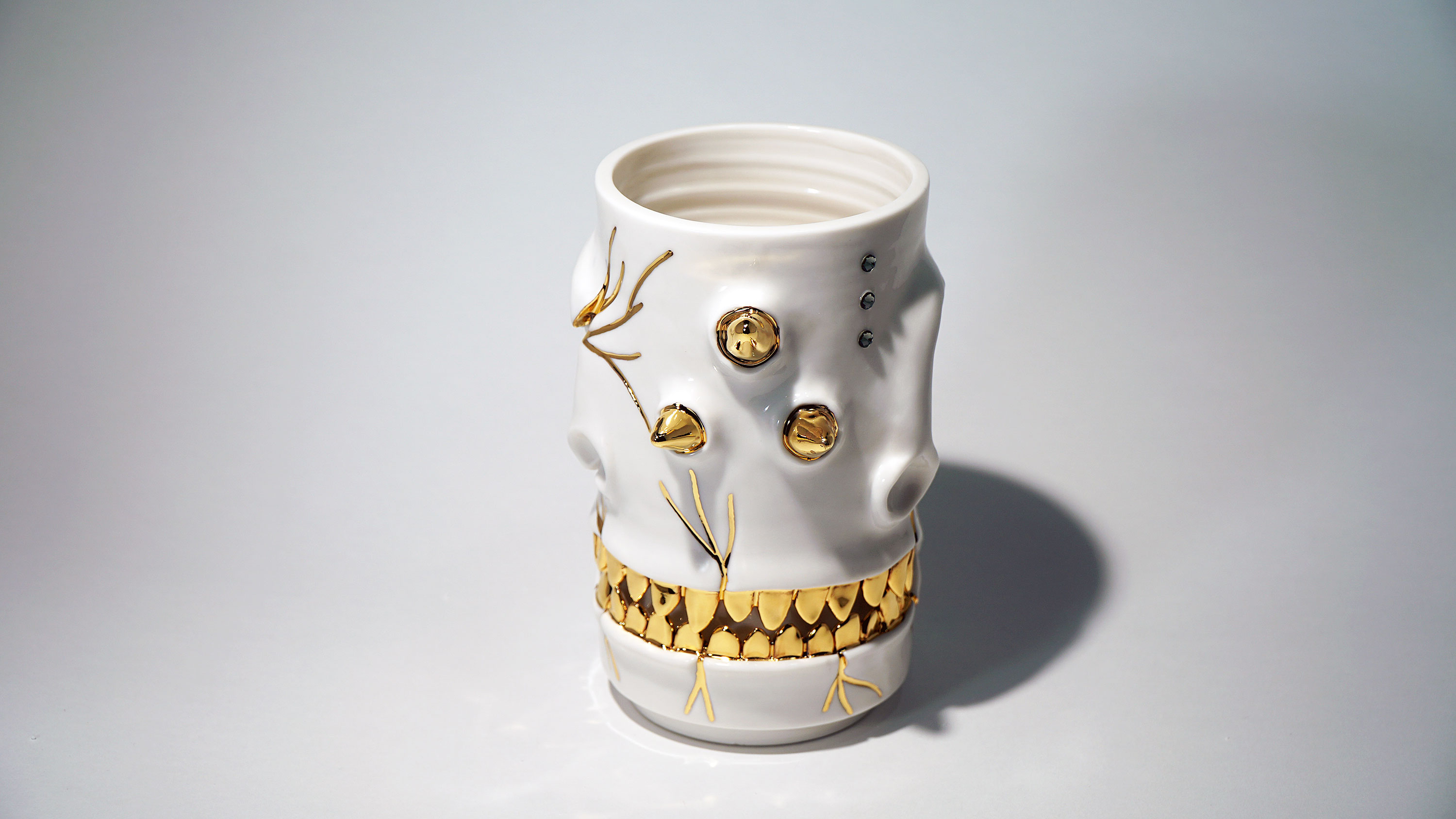 Dogabi Flower Vase is crafted with white porcelain clay and gold metallic glaze as an accent.