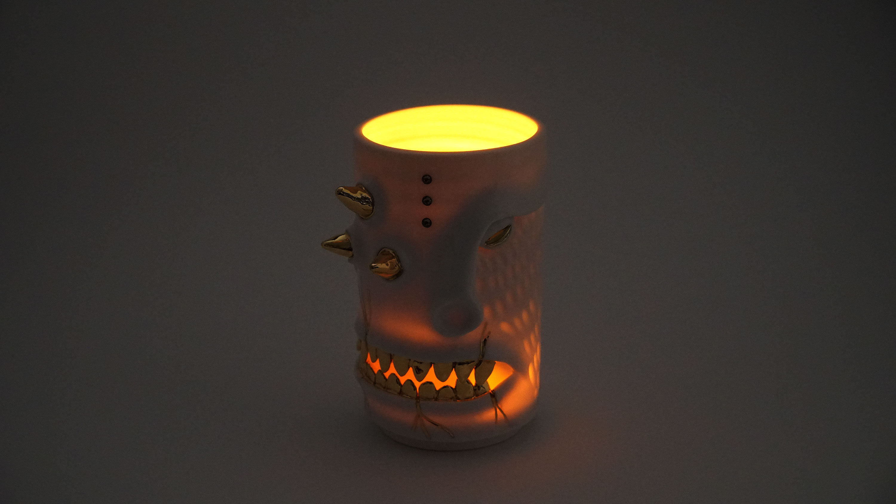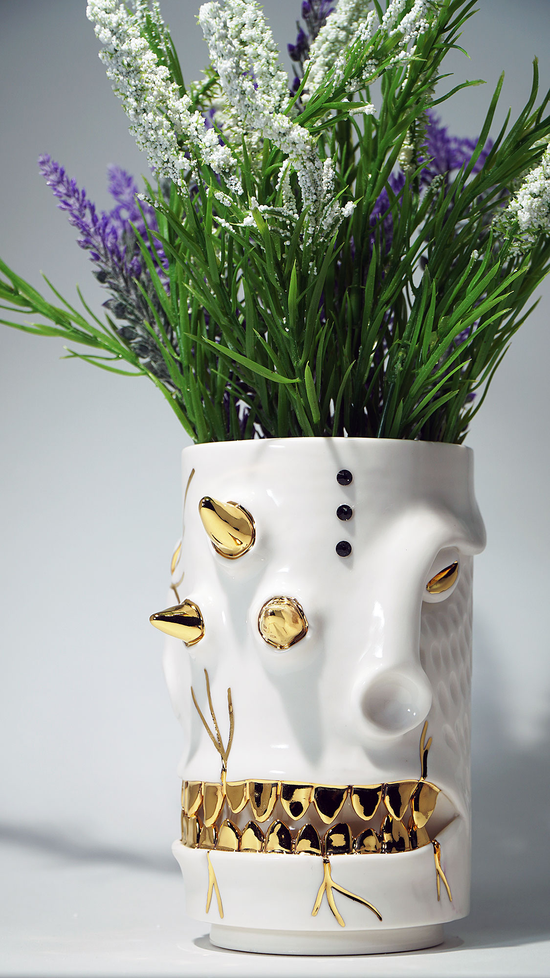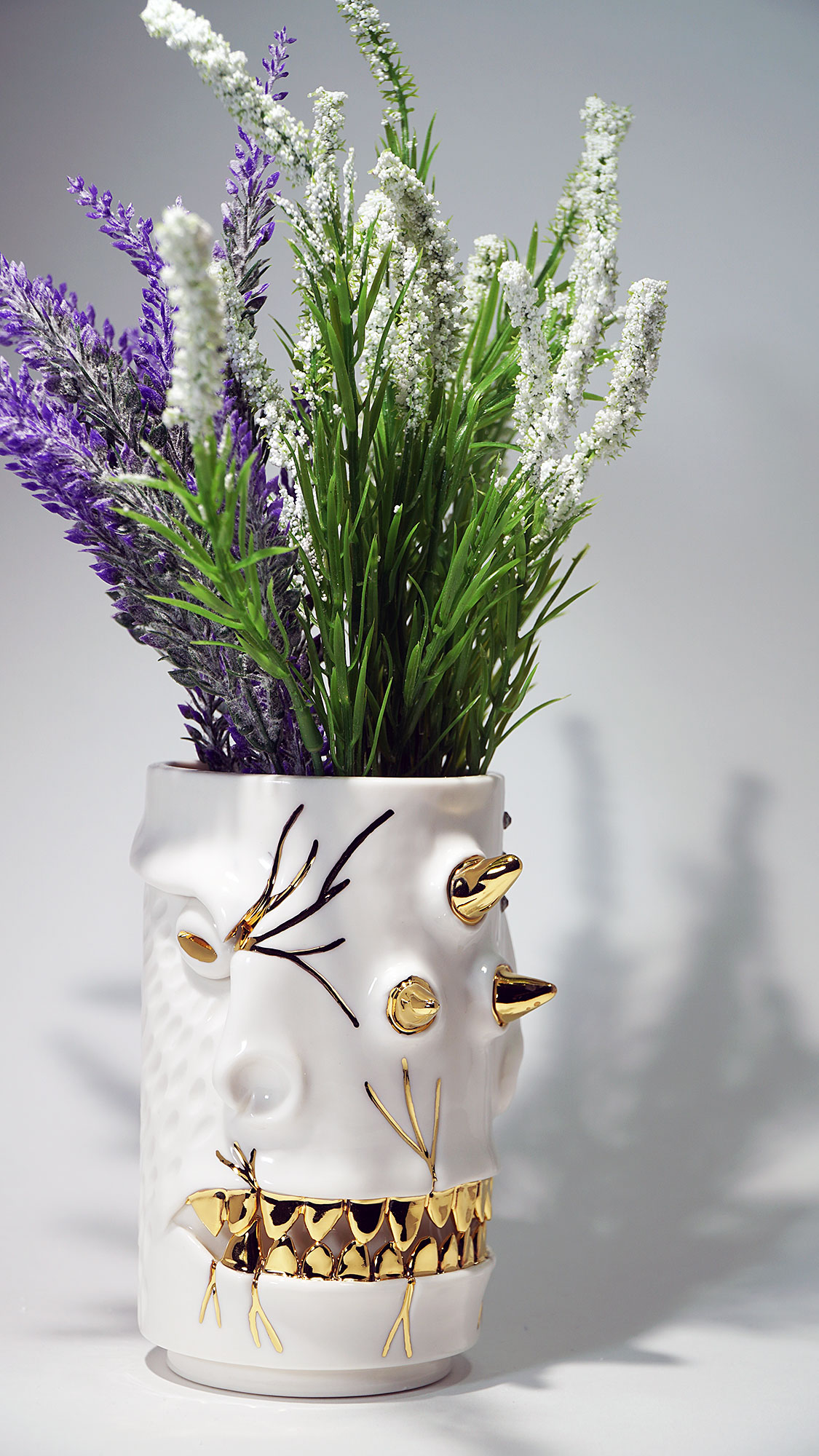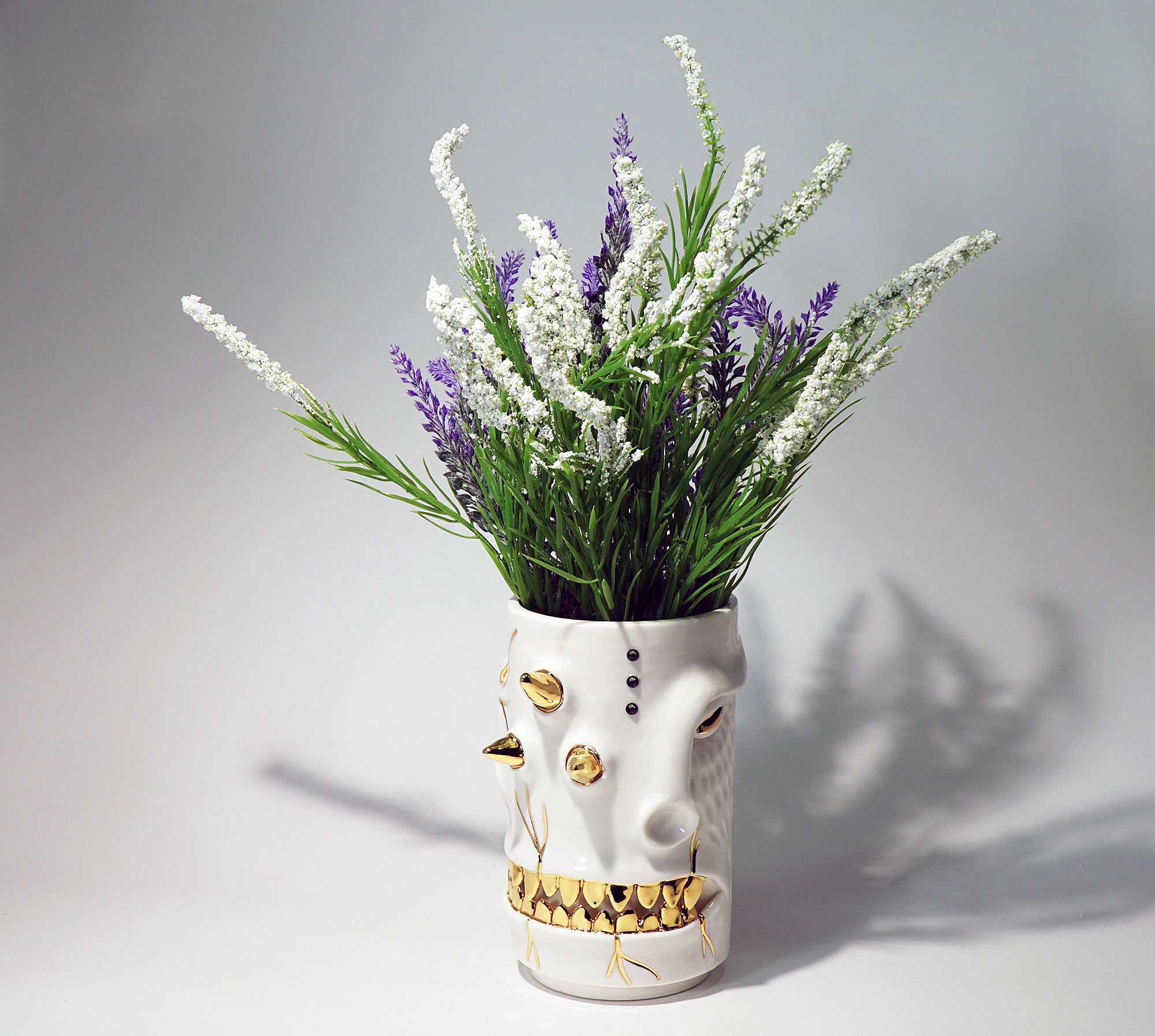 화이트와 골드로 디자인 한 돗가비 화병은 빛을 투과 시켜 은은한 빛을 만들어낸다.