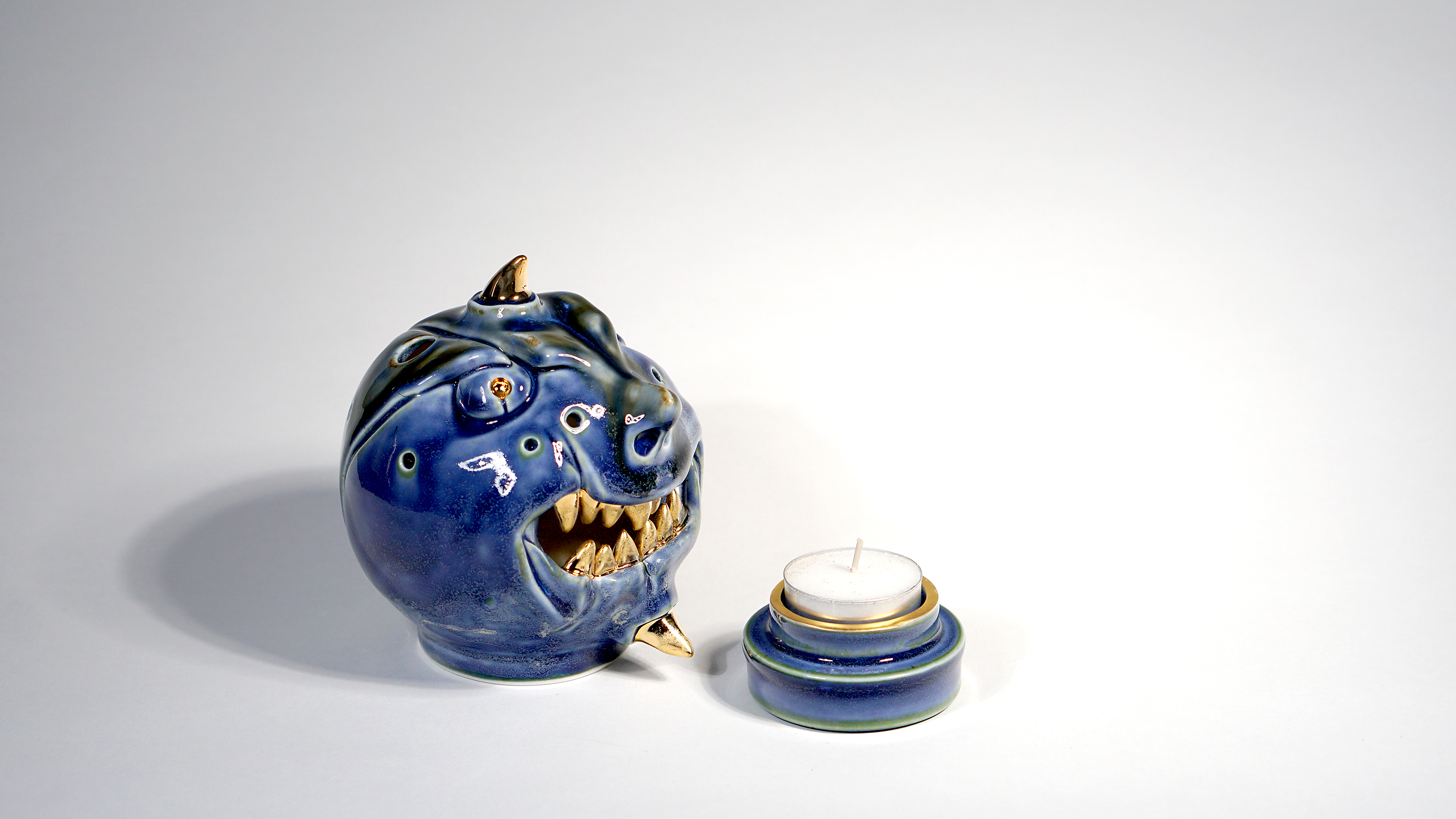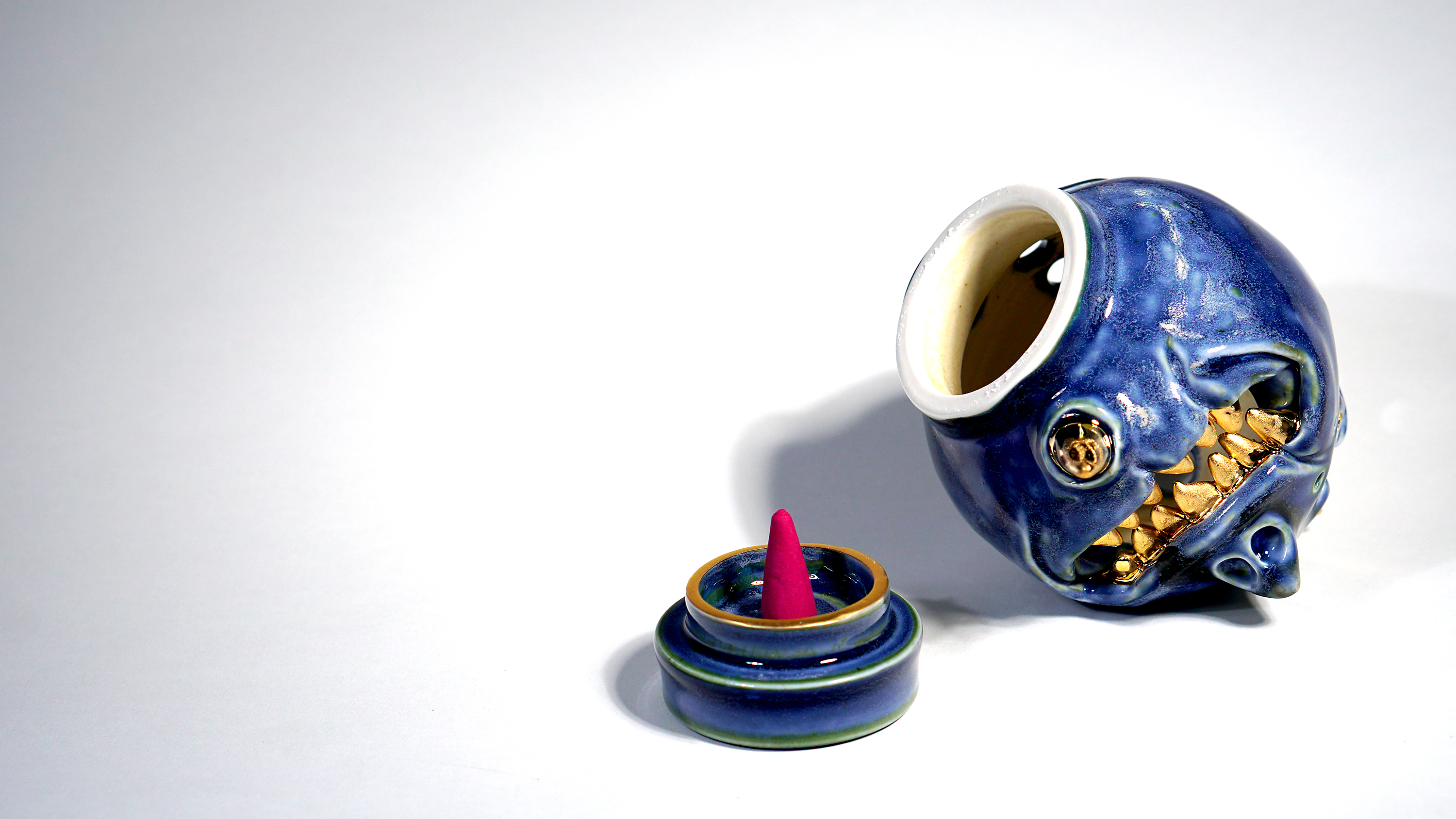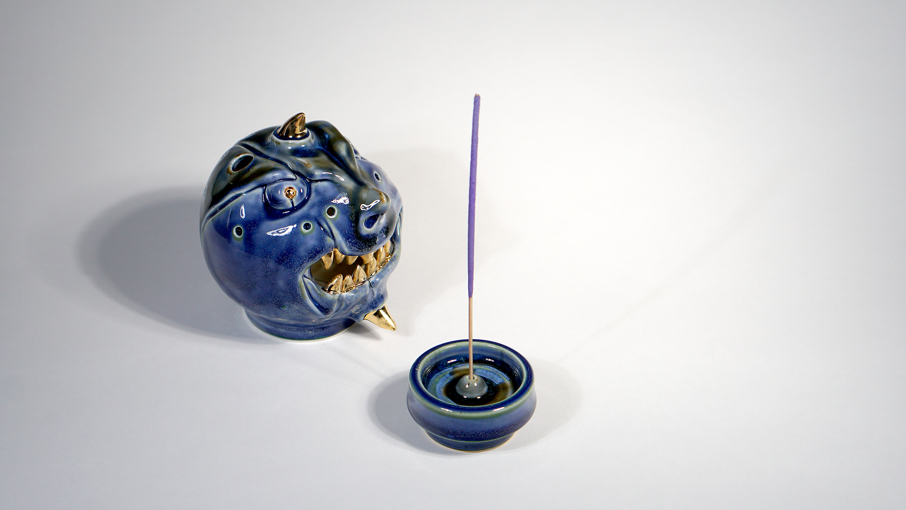 Made by sculpting and wheel throwing, the scent of incense burner spreads subtly through the hollow parts of the lid. The bottom holder is designed on both sides, which allows the user to use both cone and stick incense.