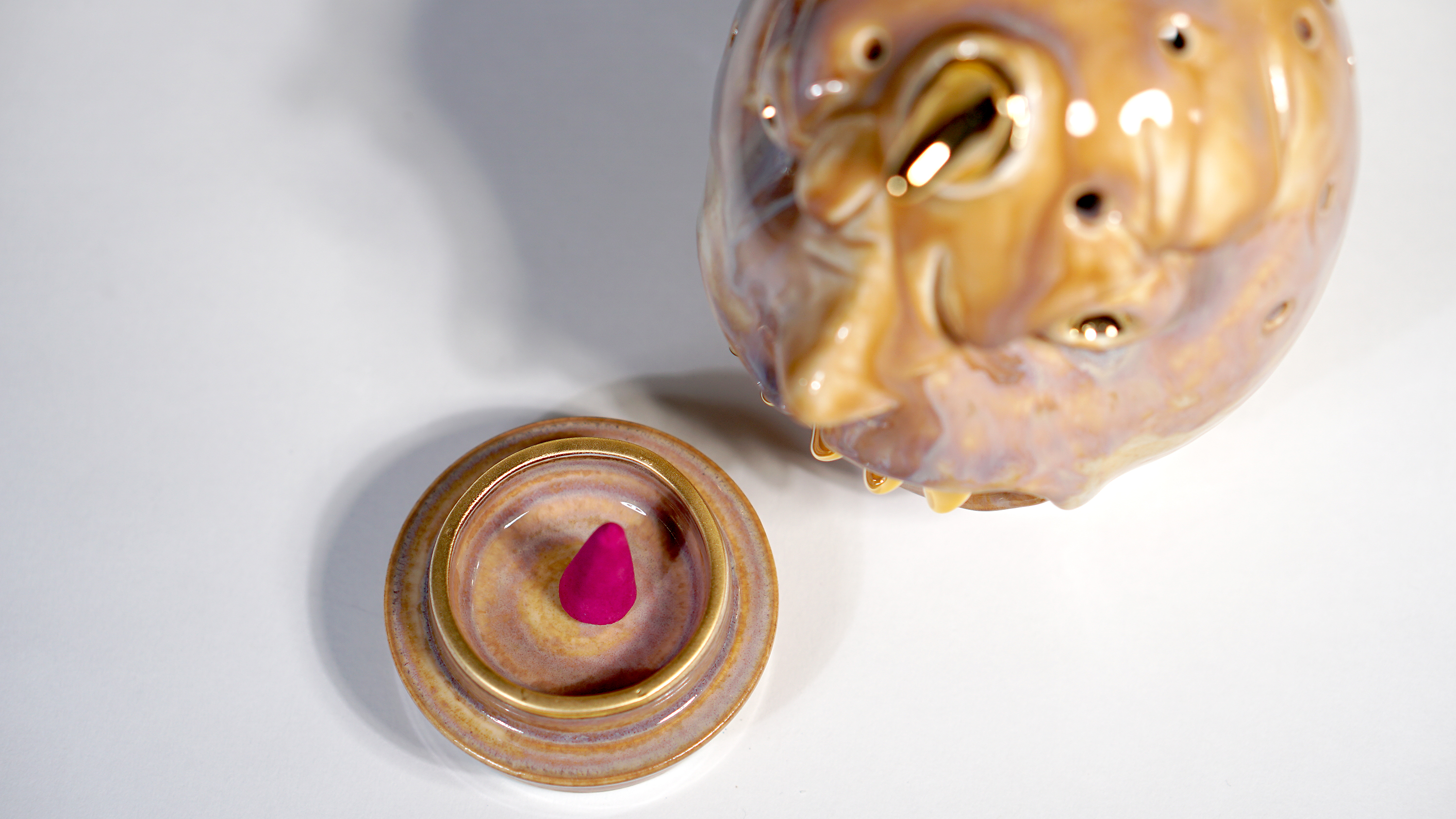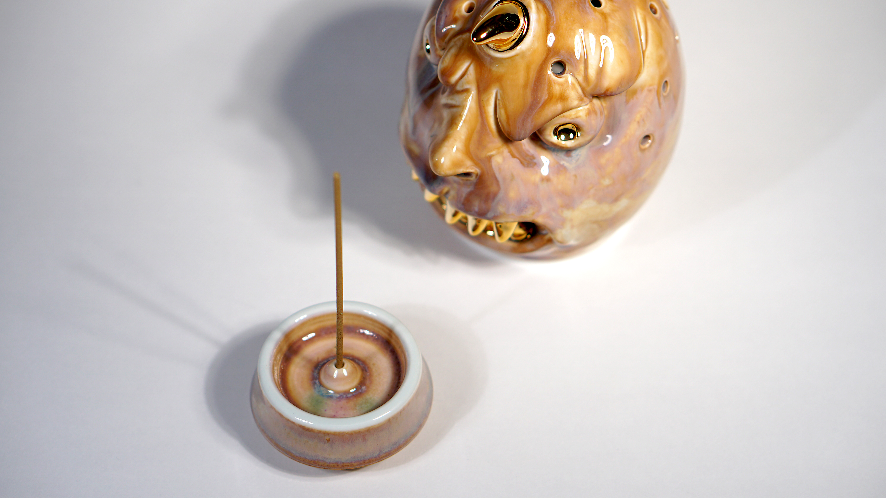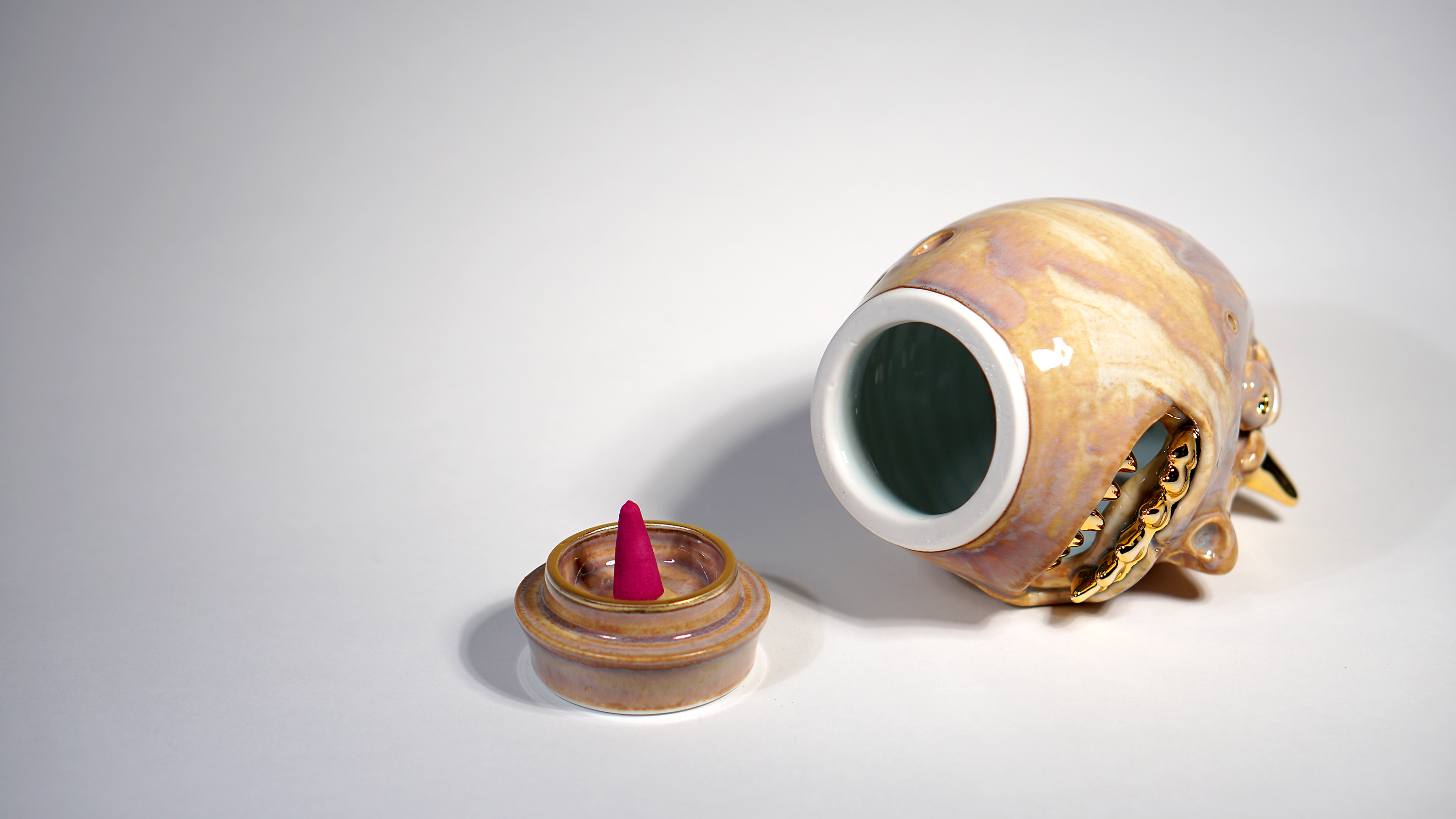 Made by sculpting and wheel throwing, the scent of incense burner spreads subtly through the hollow parts of the lid. The bottom holder is designed on both sides, which allows the user to use both cone and stick incense.