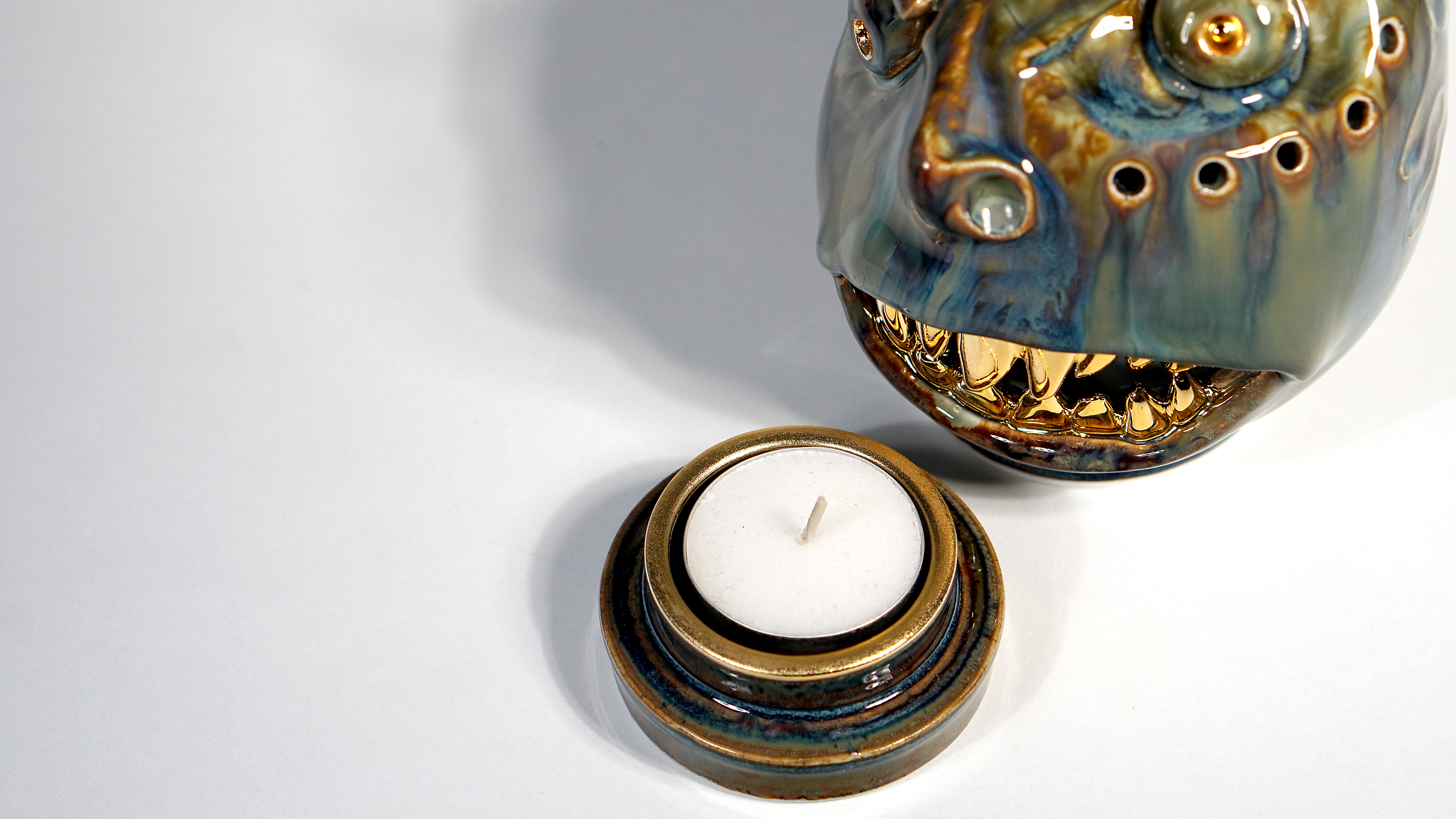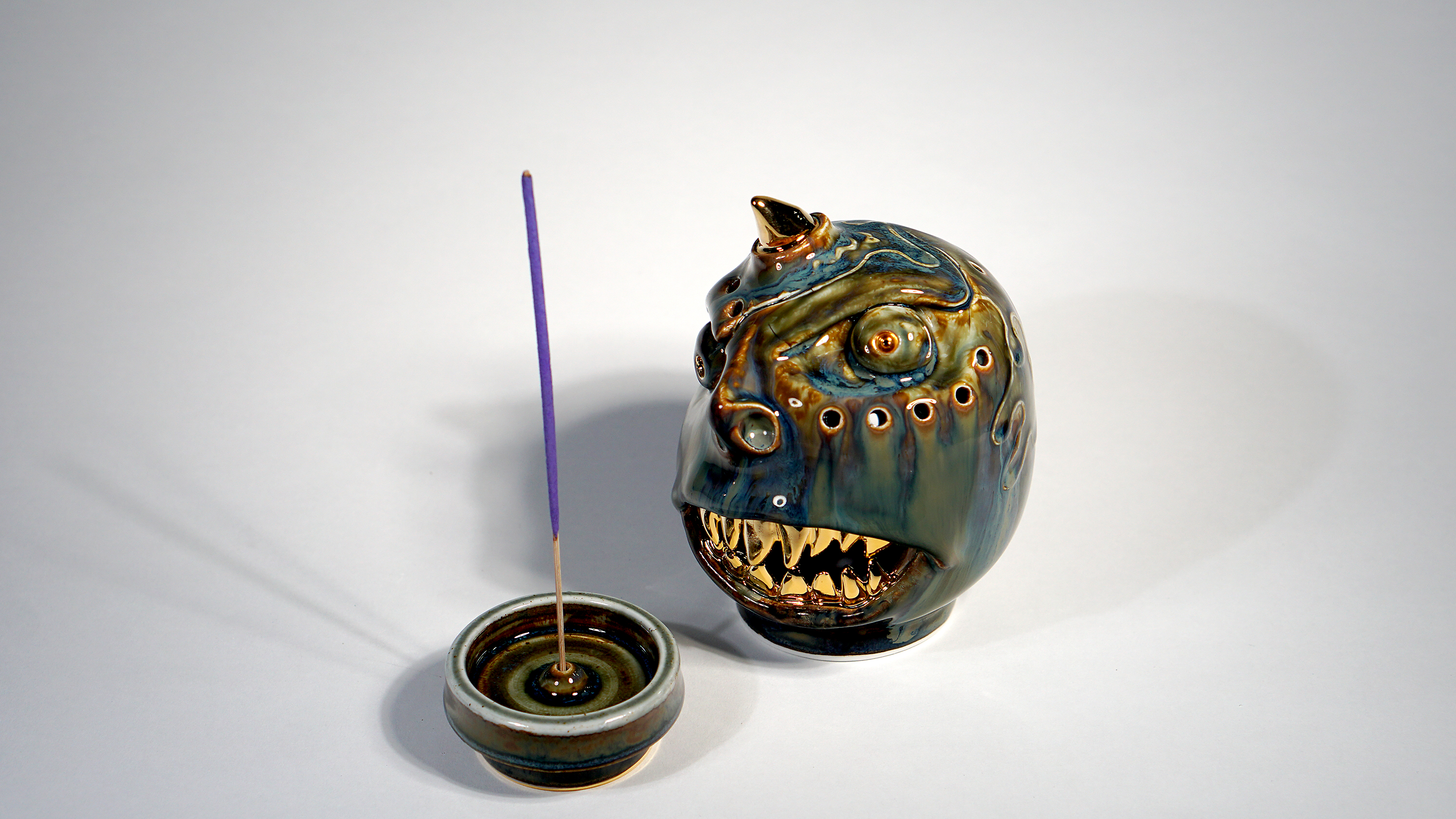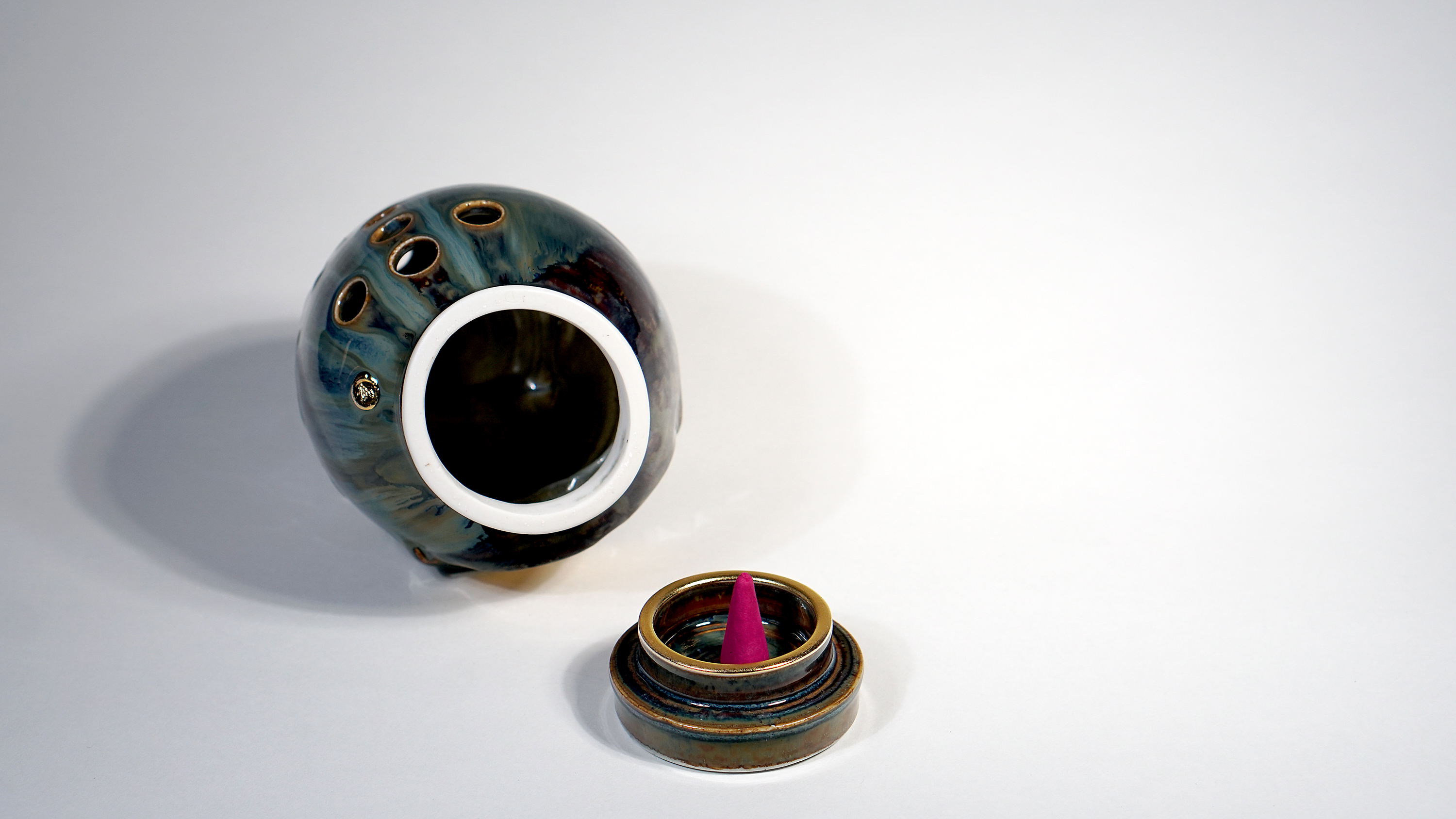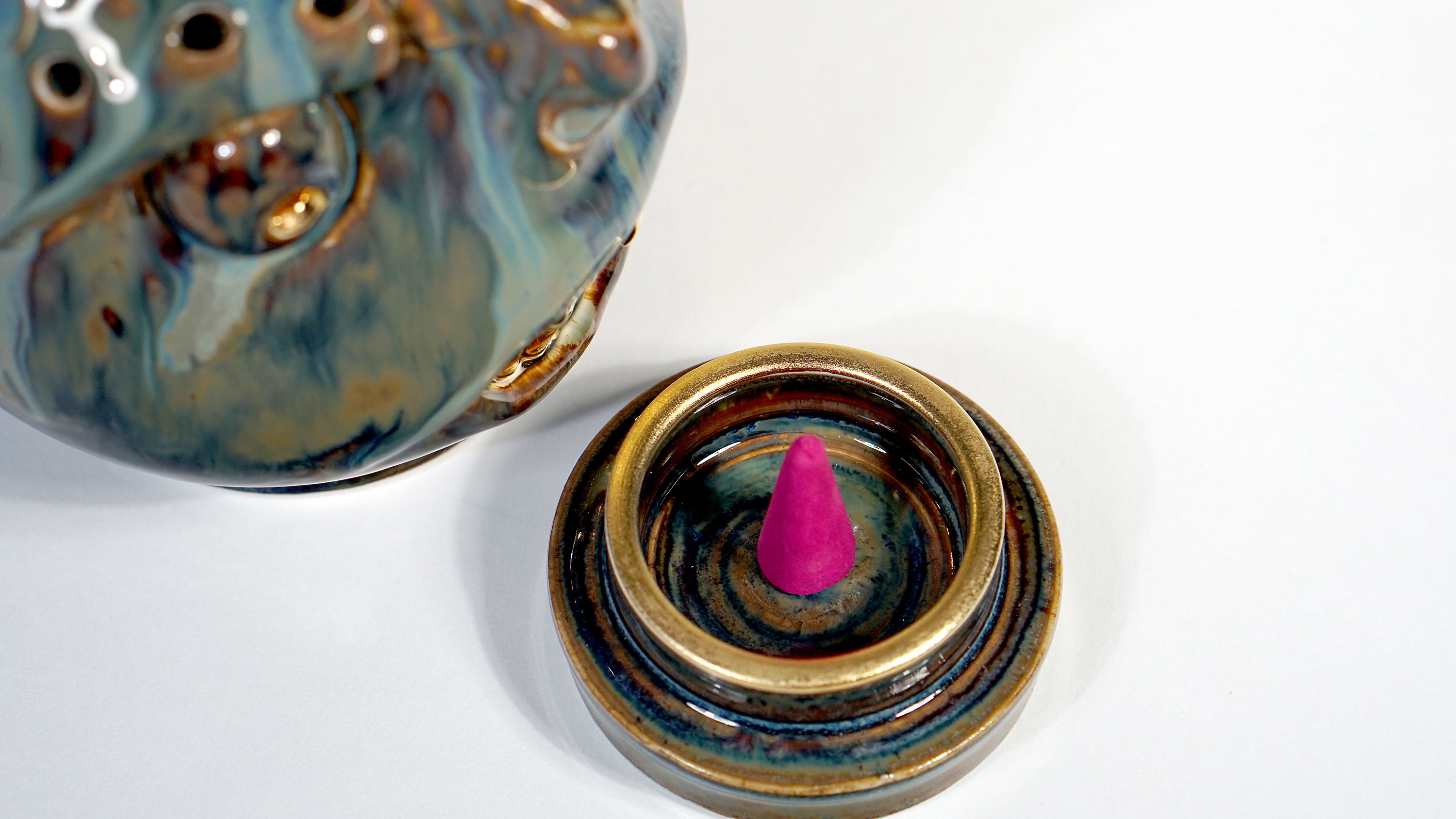 Made by sculpting and wheel throwing, the scent of incense burner spreads subtly through the hollow parts of the lid. The bottom holder is designed on both sides, which allows the user to use both cone and stick incense.