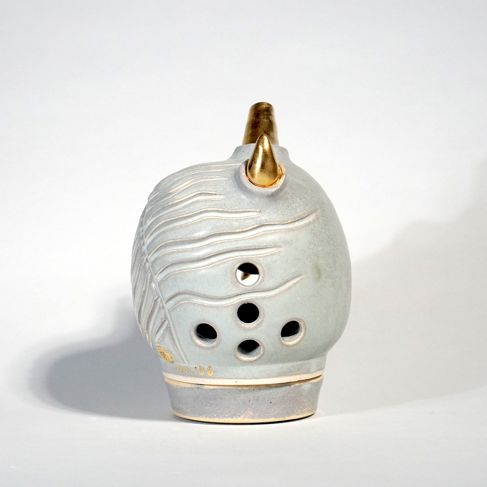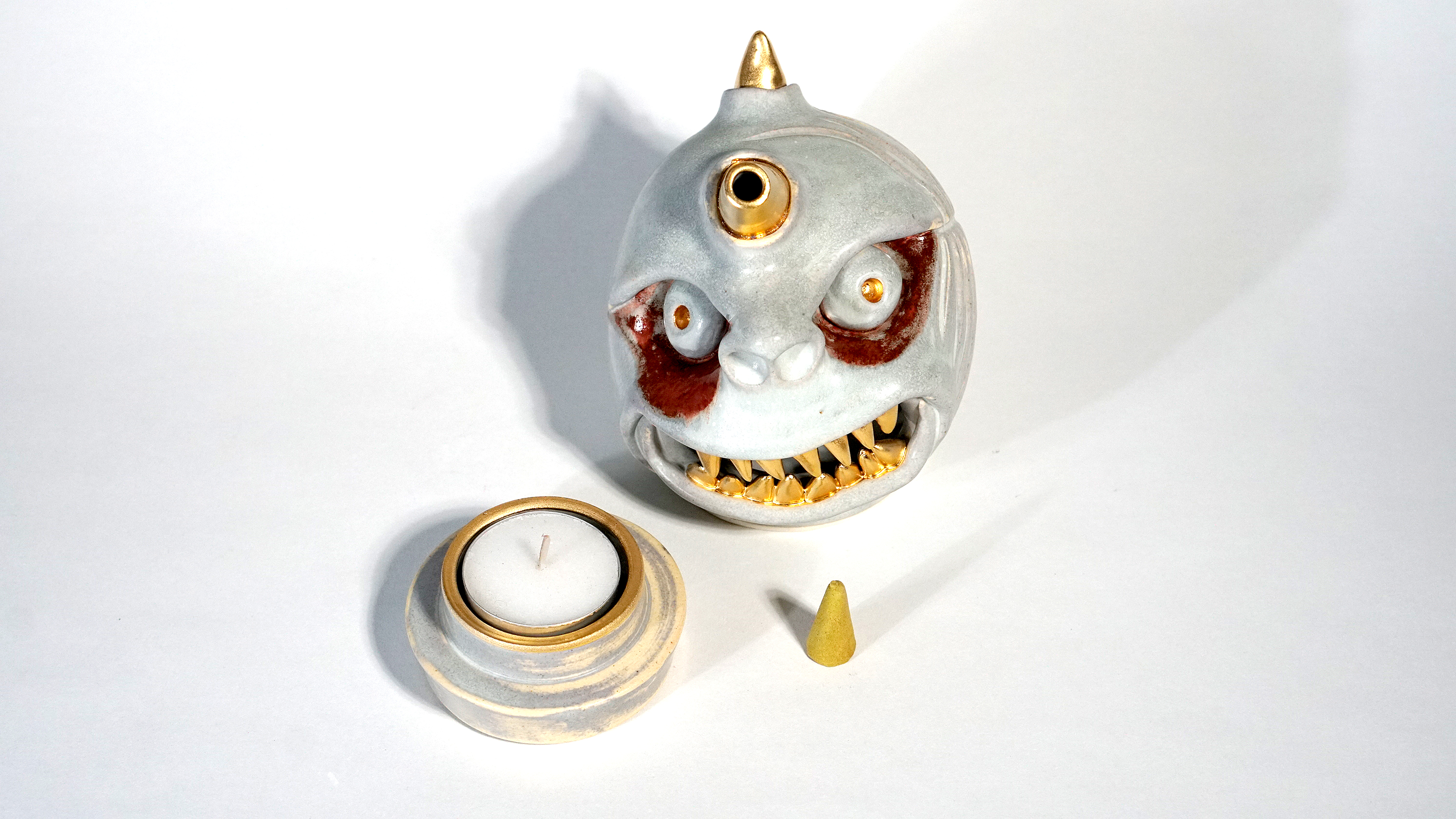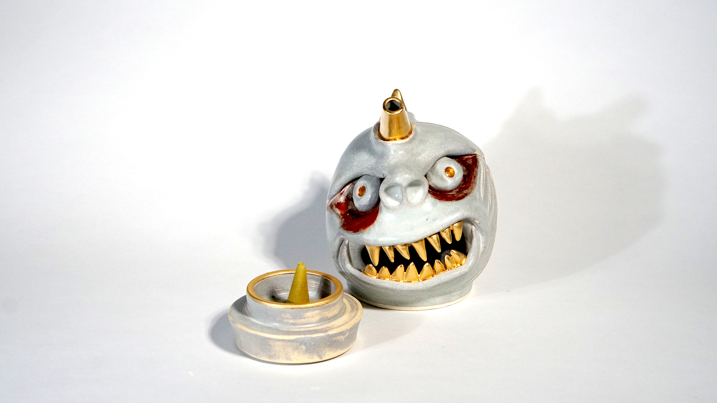 Made by sculpting and wheel throwing, the scent of incense burner spreads subtly through the hollow parts of the lid. The bottom holder is designed on both sides, which allows the user to use both cone and stick incense.